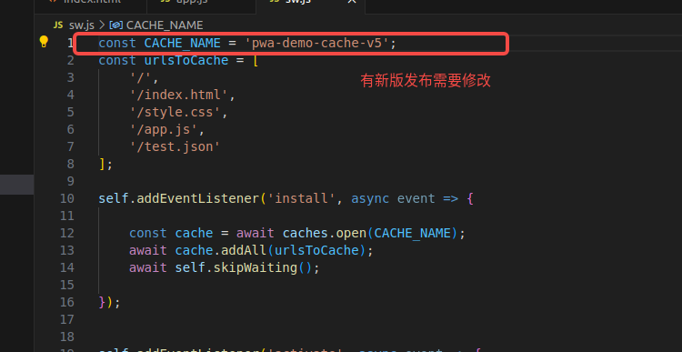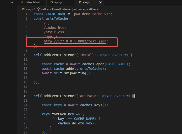 const CACHE_NAME = 'pwa-demo-cache-v1'; const urlsToCache = [ '/', '/index.html', '/style.css', '/app.js' ];