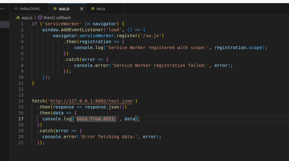 if ('serviceWorker' in navigator) { window.addEventListener('load', () => { navigator.serviceWorker.register('/sw.js') .then(registration => { console.log('Service Worker registered with scope:', registration.scope); }) .catch(error => { console.error('Service Worker registration failed:', error); }); }); }